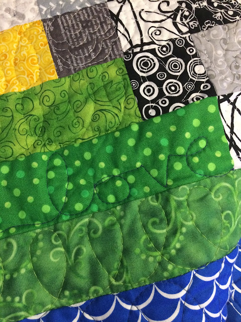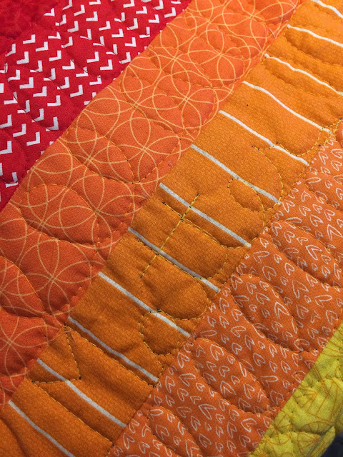 It is labeled and you can see that I changed the binding color around the bottom water on the quilt. Because madness. I kept track of the bobbins, I used 19 on this quilt. Plus all of these colors on the front.