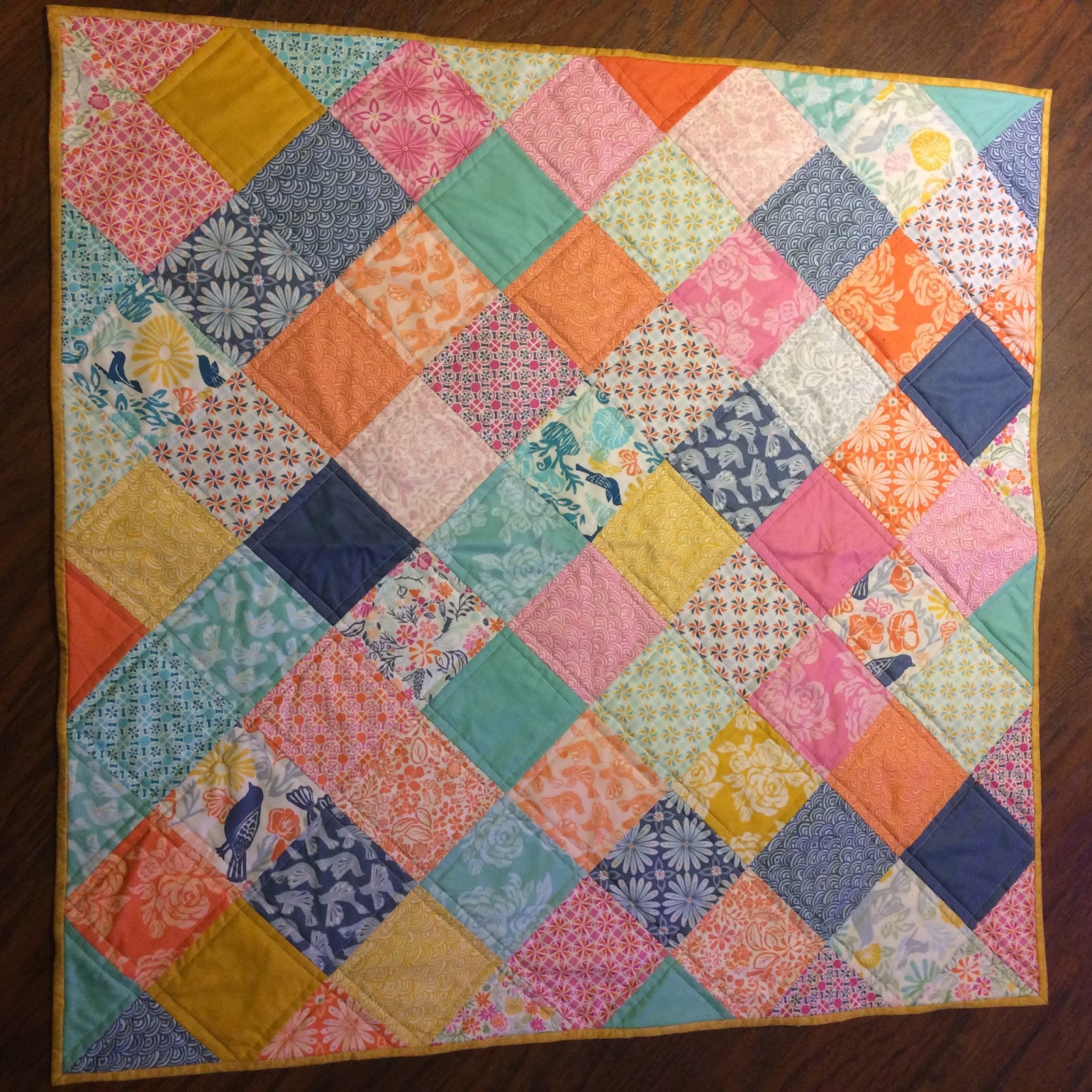 The backing and binding were already in my stash and happened to also be by the same fabric designer, Kate Spain. The backing is of course flannel. Because flannel. Binding is hand sewn to the back.